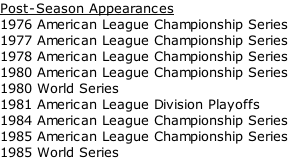 Frank White was the best player to come out of the academy, and the only one to have a long big league career. In his first 11 seasons as a regular, the Royals advanced to the post-season seven times. In 1980, Frank was named Most Valuable Player of the American League Championship Series, when he hit .545 with six hits and three RBI in Kansas City's three-game sweep of the Yankees. White spent all of his 18 seasons as a member of the Royals, earning five All-Star berths and a Silver Slugger Award to go along with his defensive honors. His range on artificial turf was unmatched in his era